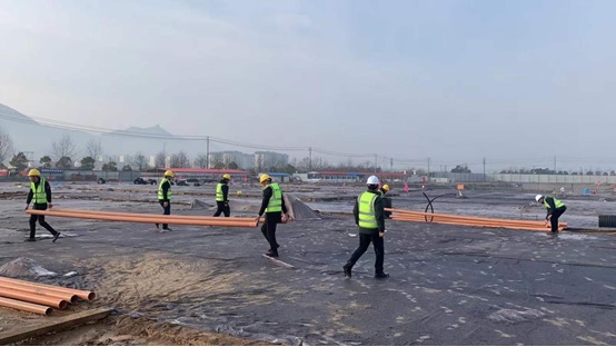 年三十,混凝土初凝,均在養(yǎng)護(hù)期內(nèi),吊裝設(shè)備雖不能進(jìn)場,但項(xiàng)目建設(shè)進(jìn)度絲毫沒有懈怠。參建各方組織力量,搶抓能夠施工的地方,項(xiàng)目管理人員放棄節(jié)假日奔赴現(xiàn)場指導(dǎo)施工,水電班組全員到崗鋪設(shè)水電管道,為下一步準(zhǔn)備區(qū)、緩沖區(qū)的板房安裝及隔離區(qū)的打包房安裝做好充足的準(zhǔn)備工作。