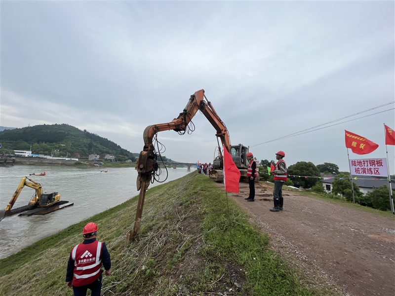 5月11日上午,根據市、區(qū)防指的統(tǒng)一部署,宣城市暨宣州區(qū)2023年防汛搶險實戰(zhàn)演練活動在朱橋鄉(xiāng)北山港口舉行,共27支抗洪搶險隊參與演練活動。演練內容包括打樁、加子埂、反濾圍井、開溝導滲、水下?lián)岆U、水上編隊航行和人員搜救轉移演練。安徽鰲峰建設集團有限公司搶險隊共10人參加陸地鋼板樁演練。