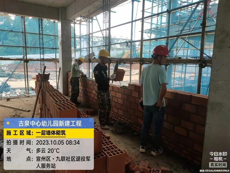 在宣州區(qū)古泉中心幼兒園項(xiàng)目,為了保障明年秋季招生,施工隊(duì)伍正在對一層墻體進(jìn)行砌筑。