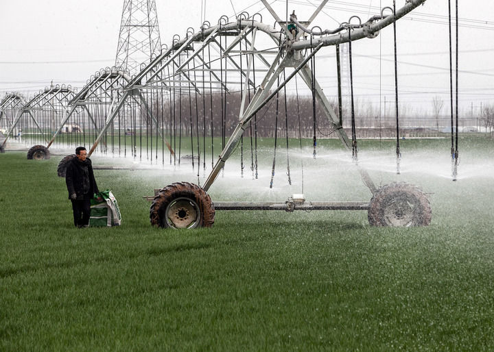 村民使用全自動(dòng)指針式噴灌機(jī)進(jìn)行澆灌作業(yè)。新華社發(fā)(程全攝)